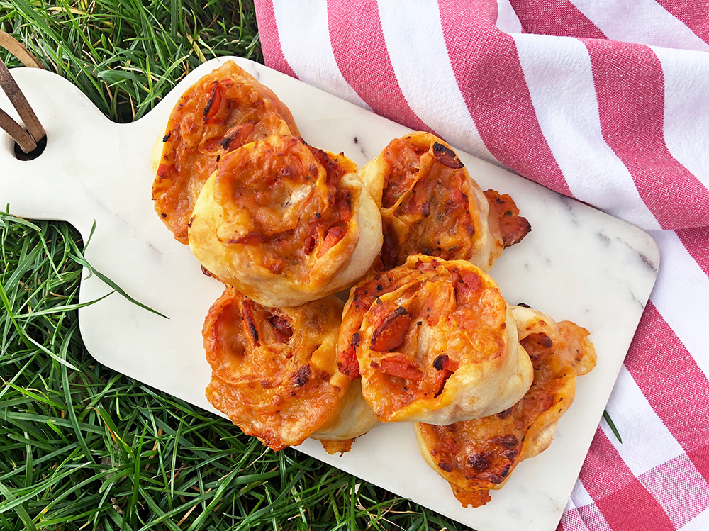 Disse ble skikkelig saftige og smakfulle, barna elsket de – og jeg må innrømme at jeg lurte til meg noen selv også. De er perfekte som piknik-mat, da de er lette å ta med og lette å spise. Du kan selvfølgelig toppe snurrene med det du ønsker, men pølse i tomatsaus med smeltet ost, er OG blir en slager! Skulle det mot formodning bli noen til overs, kan de fint fryses ned til neste gang solen titter frem og du kjenner det rocke i piknik-foten.