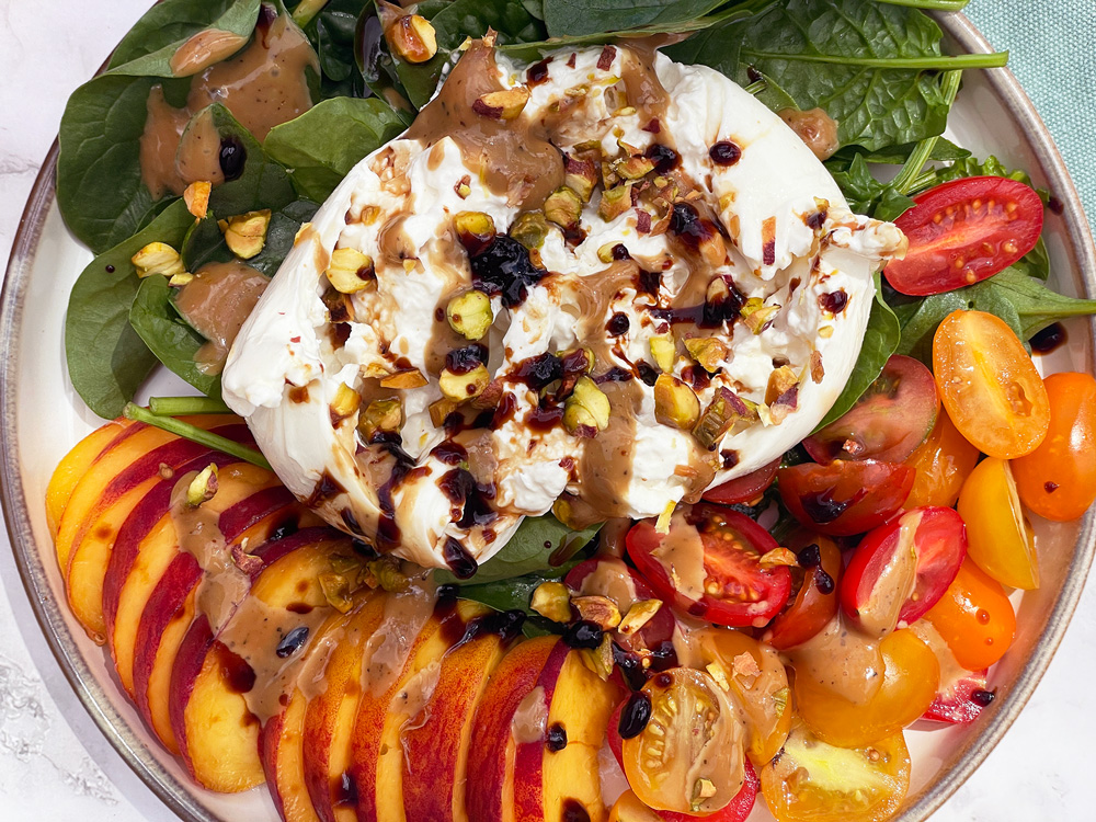 Burrata er den ultimate sommerosten, og er god i en mengde kombinasjoner. Jeg elsker spesielt denne nydelige og fargerike komboen: med solmoden og søt fersken, cherrytomater fulle av antioksidanter, vitamin-, mineral- og fiberrike spinatblader – og chrunchy pistasjnøtter med sunne fettsyrer. Ja, jeg vil faktisk kalle dette for en næringsrik “godtebolle” for kropp og sjel!