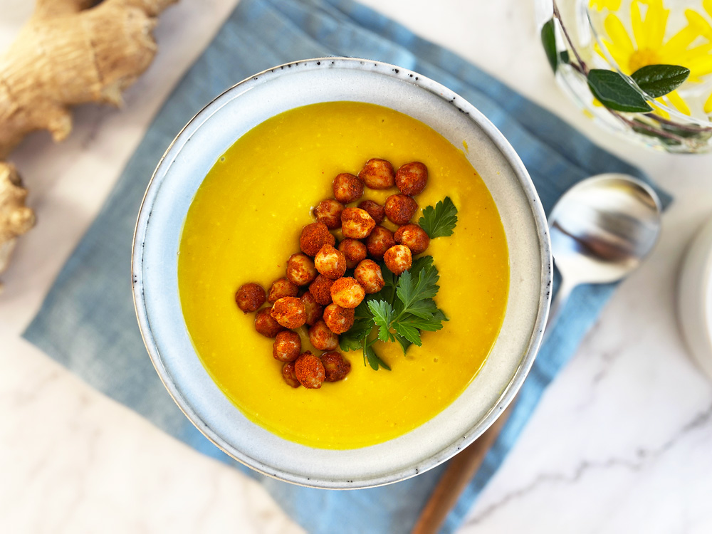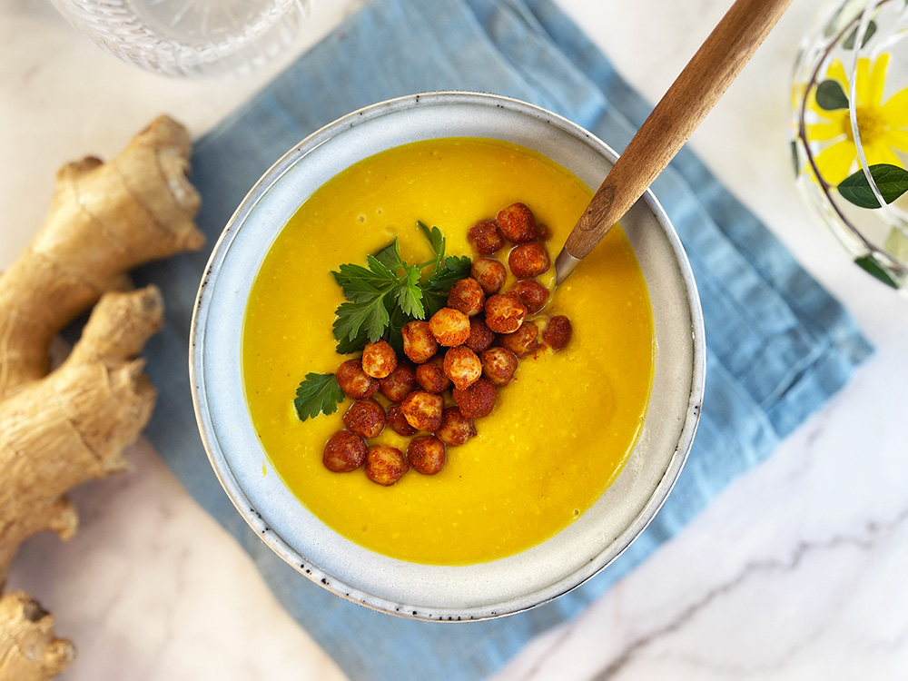 Golden soup lages av antioksidant- og vitaminrike grønnsaker, helende hønsekraft, fiberrike kikerter – og to av de fremste forsvarssoldatene ingefærrot og gurkemeie, som blant annet styrker immunforsvaret. Og nevnte jeg at den smaker fantastisk godt?!