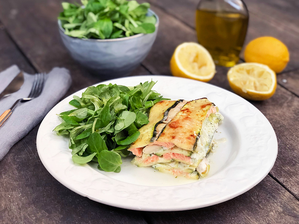 Åkei. Så er kanskje ikke dette en lasagne i sin helt rette forstand. Den inneholder nemlig ikke pasta, noe som til manges lykke gjør den glutenfri. Dette er en sunn lasagne med lag på lag med tynne squashskiver (som erstatter pastalagene), ostesaus, laks og purre. Og den smaker aldeles nydelig!